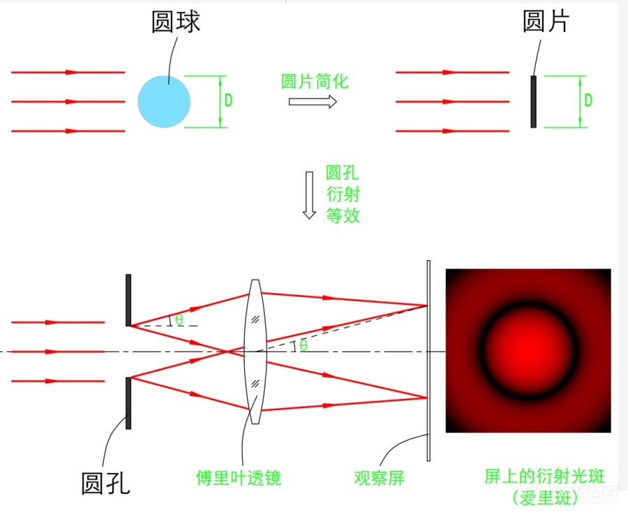 圆孔的衍射在19世纪末就有解析形式的理论表达。远场的衍射理论称为“夫朗和费衍射理论”。图2还表示出了观察远场衍射的经典装置:在圆孔后放置一个光学透镜,在透镜的焦平面上放置观察屏,这样在屏上看到的图像就是远场衍射光斑。衍射角度为的衍射光落在屏上的位置到屏的中心的距离为( 是透镜的焦距)。顺便科普一个光学名词:如果透镜是对焦平面消像差的,该透镜就称为“傅里叶透镜”。