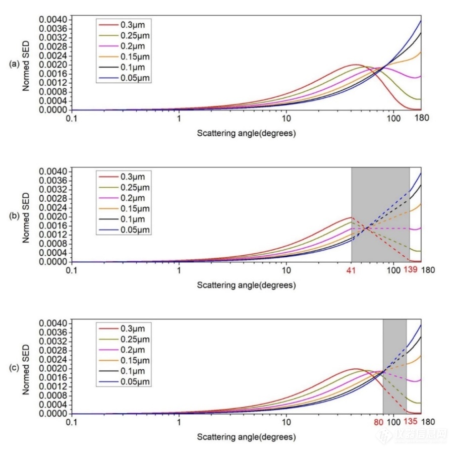 亚微米颗粒的散射光能分布见图5,其中假设了探测器的面积与散射角成正比,照明光是线偏振光,偏振方向垂直于散射面。其中图(a)表示全角范围内完整的散射光能分布。从中可以看出,垂直偏振散射光是分布在0°到180°的全角范围内的,对0.3微米以细的颗粒来说,散射光能的主峰分布处在40°到90°的前向大角度上。由于光能分布的主峰位置(如果有)与粒径之间有最显著的特异性,因此获取40°以上的散射光信息对亚微米颗粒测量至关重要。