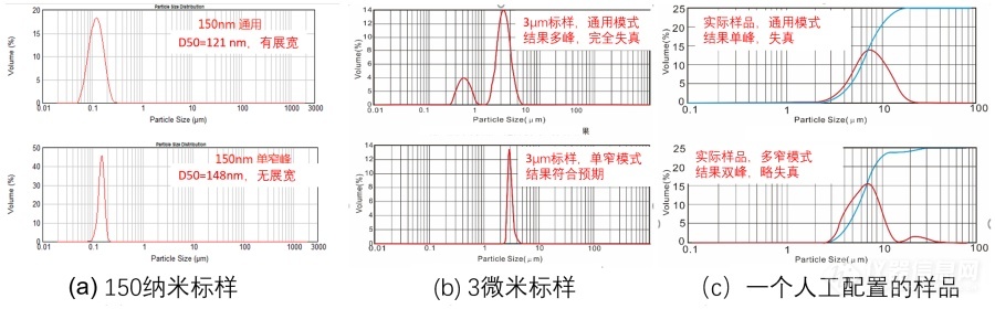 图7是该仪器的实测案例。图7(a)是标称D50为150纳米的聚苯乙烯微球标样的测量结果。选“通用”模式时,D50为121纳米,与样品标称值相差较远,且分布曲线明显展宽;选”单峰窄分布”模式时,D50为148纳米,与样品标称值相符。图7(b)是标称D50为3微米的标样的测量结果。选“通用”模式时,结果呈现多峰,与样品的单分散特征完全不符;选“单峰窄分布”模式时,与样品形态特征及标称值相符。图7(c) 是一个人工配制的3个峰的SiO2 微球。选“通用”模式时,结果只有1个峰,完全失真;选“多峰窄分布”模式时,曲线呈现2个峰,结果比“通用”模式接近真实,但还是有失真。
