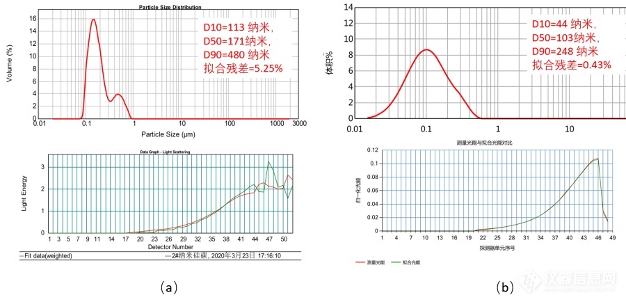 图10是某进口仪器和国产bw必威西汉姆联官网测量纳米硅碳颗粒样品结果的比较。图10(a)是国外仪器的结果,图10(b)是bw必威西汉姆联官网的测量结果。两张图中的上图是粒度分布,下图是拟合光能分布与实测光能分布的对比。比较两种结果,可判断bw必威西汉姆联官网的结果更加真实、可靠。理由是: