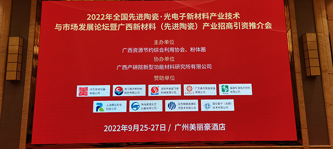 2022年9月25-27日,由陶瓷行业知名媒体--粉体圈主办的"2022年全国先进陶瓷·光电子新材料产业技术与市场发展论坛暨广西新材料(先进陶瓷)产业招商引资推介会”在广州美丽豪大酒店如期举行。本次先进陶瓷论坛共吸引陶瓷材料生产企业与仪器设备展商共40家,先进陶瓷行业专家及专业人士300余人出席。